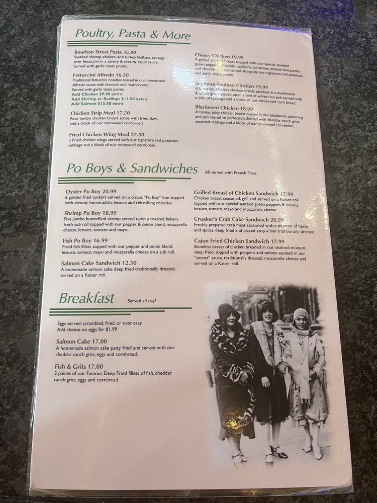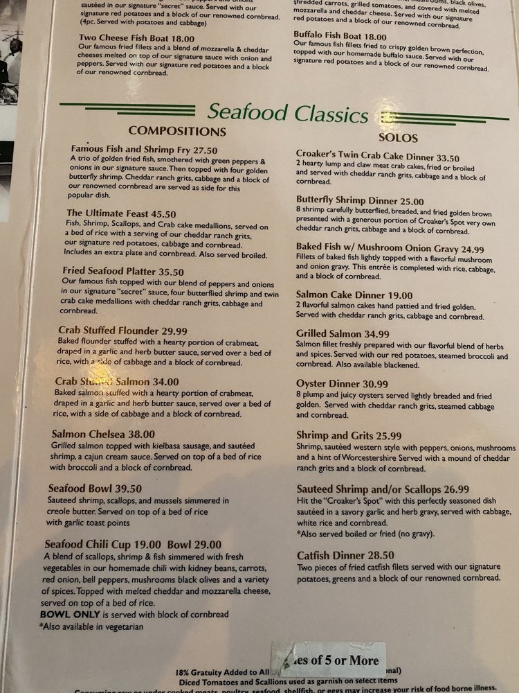 Hit the "Croaker's Spot" with this perfectly seasoned dish sauteed in a savory gravy, served with cabbage, white rice, and cornbread. Also served broiled (No gravy/topped with garlic and herb butter or fried)